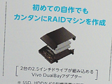 小型PCながらRAIDに対応するのも特徴。本体内部には3.5インチシャドウベイ1基が用意されているが、付属のマウンタ「Vivo DualBayアダプター」を用いることで2.5インチドライブが2基まで搭載でき、RAID 0/1構成が可能としている。ストレージインターフェイスは6Gbps SATA×2。