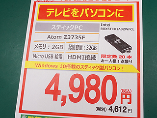 9/10 21:27追記 10日(土)に好評だったIntel純正スティックPC「BOXSTCK1A32WFCL」は、11日(日)にも税込4,980円で販売予定。数量は限定30個。購入は1人1個まで。