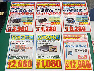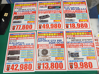 セール品の一例を挙げると(以下、全て税込表記)、Windows 10を搭載したIntel純正スティックPC「BOXSTCK1A32WFCL」が4,980円(限定20個)、同店指定SSD 250GBが5,980円(限定20個)、玄人志向 GF-GTX1080-E8GB/OC/DF(GeForce GTX 1080)が77,800円(限定2個)、ASUS STRIX-GTX1070-8G-GAMING(GeForce GTX 1070)が49,980円(限定2個)など。