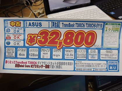 一例を上げると、TransBook T300Chi(T300CHI-5Y10)(12.5型2in1 PC,Core M-5Y10,メモリ4GB,eMMC 128GB,フルHD,Windows 8.1 64bit)が税込32,800円、ZenPad 3 8.0(Z581KL)(7.9型Androidタブレット,2048×1536ドット,Snapdragon 650,SIMロックフリー)が税込29,800円、ZenPad 10(Z300CNL)(10.1型Androidタブレット,1280×800ドット,Atom Z3560,SIMロックフリー)が税込21,800円など。各モデルとも保証は1ヶ月。