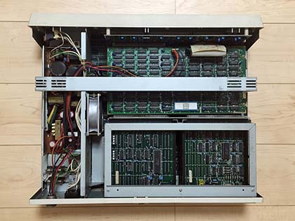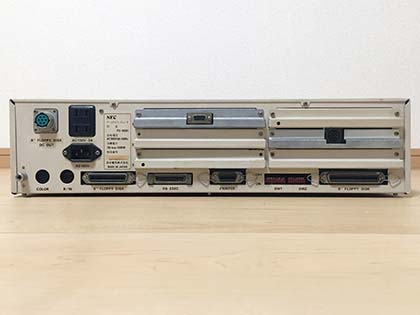内蔵されたOSは、N-BASICやN88-BASICとの互換性を考えられたN-BASIC(86)とN88-BASIC(86)で、NECの他のシリーズには無い拡張ボードでの搭載となっています。そのため、当該ボードを拡張スロットから抜くと、電源をオンにしても何も動きません。ちなみに、電源オン時に特徴的な“ピポ”と鳴るようになったのはもっと後で、本機は電源を入れても静かに電源部分のファンが回るだけです。