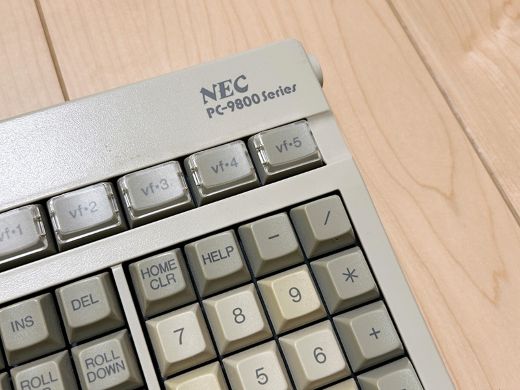 付属するキーボードは、右上に書かれている文字がPC-9801RA2やRX2の「PC-9801R」からは変更されていました。NECのロゴがvf・4キーの中央部分からスタートして、その下に「PC-9800Series」と書かれているモデルとなります。PC-9801RA21やRX21などに付属していたキーボードは、NECのロゴがvf・5キーの位置からプリントされ、その下に「PC-9800 SERIES」と“SERIES”が大文字になっていました。ただし、キータッチに関してはほぼ同じなので、どれを使用するかは気分次第でもいいかもしれません(笑)。