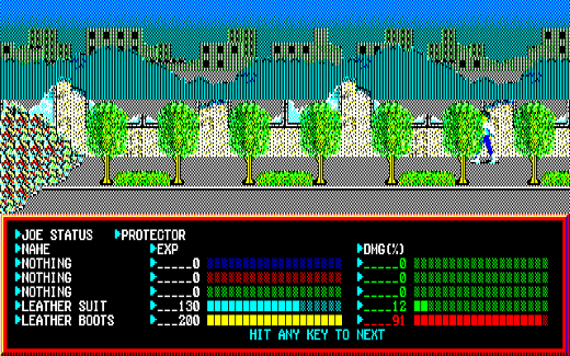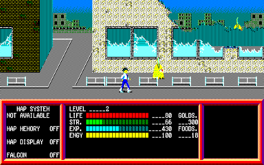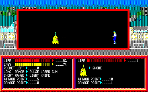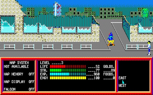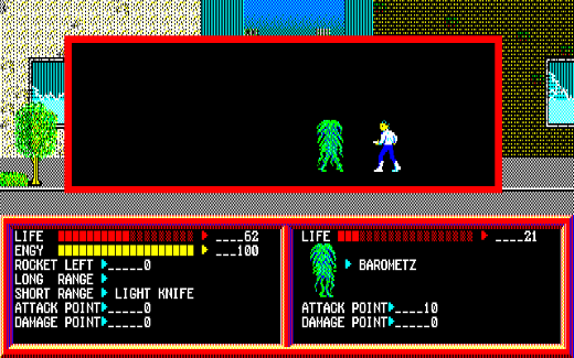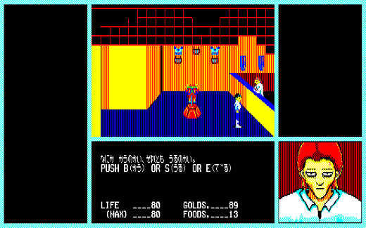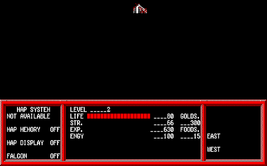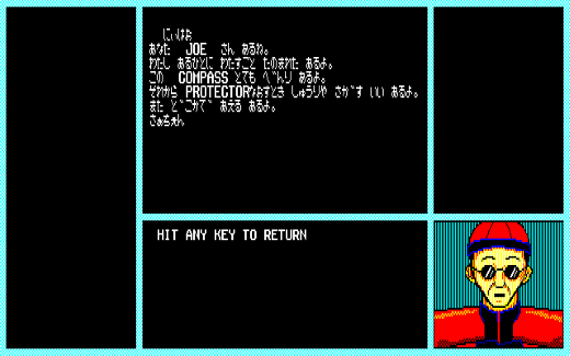プレイヤーは主人公のジョーを操作し、宇宙人との戦いに挑むこととなります。マップ上をテンキーの2、4、6、8で移動しつつ、ドアの前に立って8を押せば建物の中に入れるほか、ステータスを確認したいときはS、アイテムなどを使用する場合はU、持ち物確認はI、そしてコンピュータの一種となるファルコンを使う場合はFを、それぞれ入力します。