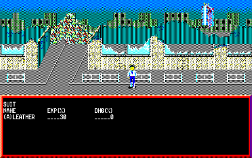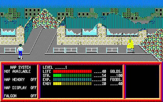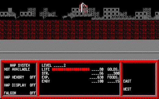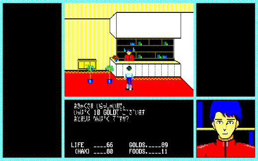 が、ゲーム開始直後はどんな戦い方をしても即ゲームオーバーに。後から気づいたのですが、主人公は装備品を持っているだけで身につけていないため、始まったらメニューを開いて防具を装備する必要がありました。これさえ行えば楽勝なのですが、敵を倒してももらえるのは経験値だけで、お金は入手できません。所持金を増やすには、敵を倒して手に入れたアイテムを武器屋で売り払う必要がありました。なお、減ったHPは食料を持っていれば自動的に回復するので、食べ物には常に気を配っておきましょう。