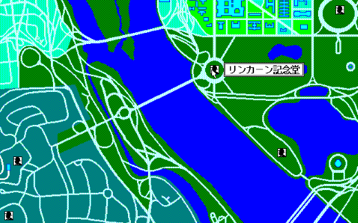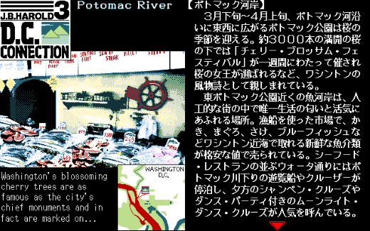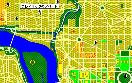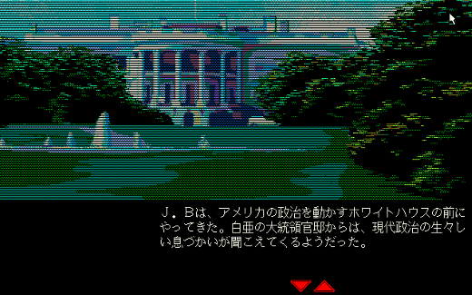 本作に登場するさまざまな移動先は実写取り込みCGとして表示されるため、非常にリアル感のあるものとなっています。前作にあたる『マンハッタン・レクイエム』では、人物以外は単色で描かれていました。今作では反対に、背景などがカラーになり人物は黄色寄りのベージュ系と茶色という落ち着いた色で表現されていて、よりしっとりとした雰囲気になっています。選択肢も、当時のMacintoshで使われていたOS、漢字Talk2.0ライクなウィンドウが用いられていて、操作もシンプルでやりやすくなっていました。モニタ上にカラーで描かれるワシントンD.C.の各所を見て、今で言うところの(プチ)聖地巡礼感が楽しめたという人も、もしかするといたかもしれません。