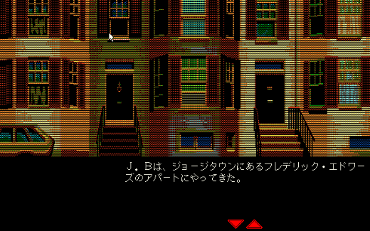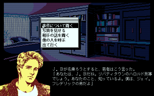 プレイヤーは主人公のJ.B.ハロルドとなり、この謎に満ちた事件を解決へと導かなければなりません。今回はPC-9801版を使用しているということで、操作方法はマウスのみとなります。移動する場合は、マップ上から行きたい場所をマウスでクリックするのみ。そこから先も、選択肢をマウスで選んでいくというマウスオペレーションシステムになっていました。