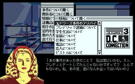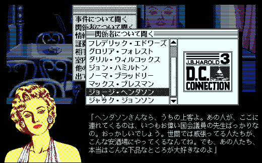 そんな流れに乗って登場したアドベンチャーゲームの1つに、刑事J.B.ハロルドが主人公を務める「J.B.ハロルド」シリーズがありました。プレイヤーがリバティタウン警察署に勤める刑事J.B.となり、さまざまな難事件を解決していくという作品ですが、1986年に発売された1作目の『殺人倶楽部』、翌87年リリースのシリーズ2作目『マンハッタンレクイエム』と、そのアナザーストーリーとなる『キスオブマーダー』が発売された後、1989年に待望のシリーズ3作目として登場したのが『J.B.ハロルド事件簿#3 D.C.コネクション 愛と死の迷路』です。どの作品もアメリカを舞台としていて、1作目こそ架空の都市リバティタウンでしたが、2作目ではニューヨークを、そして今作の現場は首都ワシントンD.C.としていました。そんな本作のストーリーは、以下のようになっています。