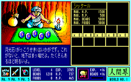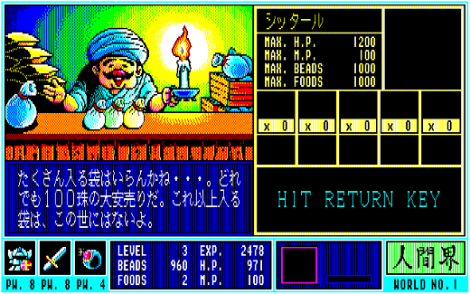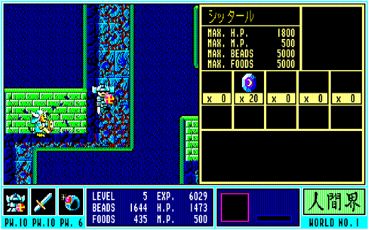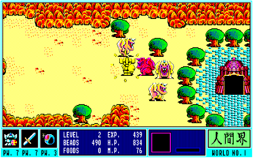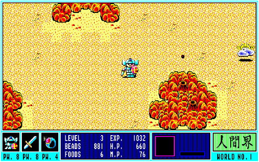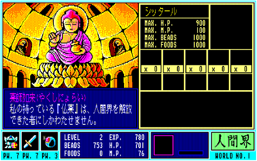 このほか、『ガンダーラ』には食料の概念が導入されていて、時間経過と共に少しずつFOODSが減少していきました。これが0になると今度はH・Pが減少していき、敵からのダメージなども合わせて0になるとゲームオーバーに……。減ってしまったH・Pは、各所にある菩提樹の前に移動してテンキーの5を押ししゃがむことで全回復させることができます。その際、BEADSをワールドナンバー(ゲーム開始直後はNo.1の人間界なので1)×100消費してしまうのですが、普通に戦っていればBEADSはそれなりに溜まるので、ホイホイと治せるのがありがたいところ。