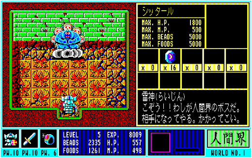 こうして経験値を稼ぎ、ある程度までレベルアップさせたら、次はいよいよダンジョンへと潜っていきます。その最深部には、この人間界を支配するボス・雷神の姿が。ただし、道中で見つける洞に潜んでいる協力者の助言を聞いて、ボスの弱点を把握していなければ勝つことはできません。無事に倒すことができれば、これまで隠れていた大勢の人間が現れます。彼らに話を聞いて情報を得たら、新たな世界へとGO!
