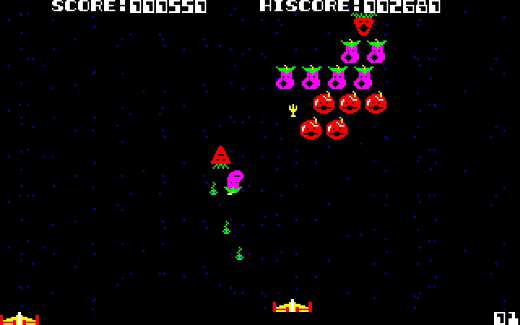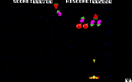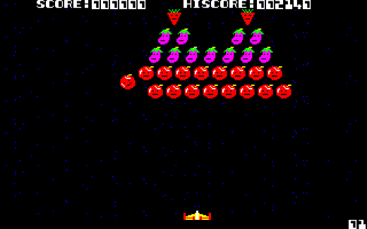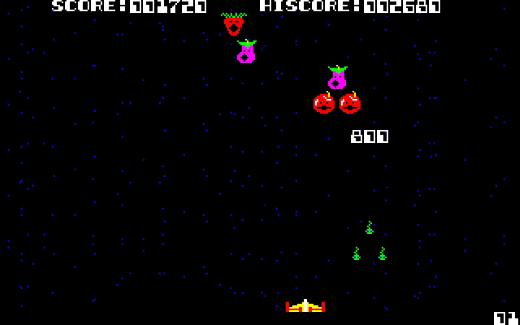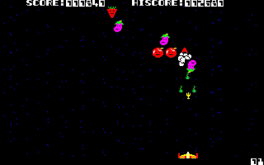 プレイヤーは自機を左右に操作し、青虫を避けながら画面上部で編隊を組んでいるにんじん、なす、りんごを、フォークを撃ち込んで全滅させるのが目的となります。この時期にゲームセンターへ出入りしていた人ならば一目見て分かったと思いますが、本作はハドソン版『ギャラクシアン』とも言える作品でした。ただし、『ギャラクシアン』の縦長自機と違い、本作の自機は思ったよりも幅が広く当たり判定が大きいので、慎重な操作が求められます。