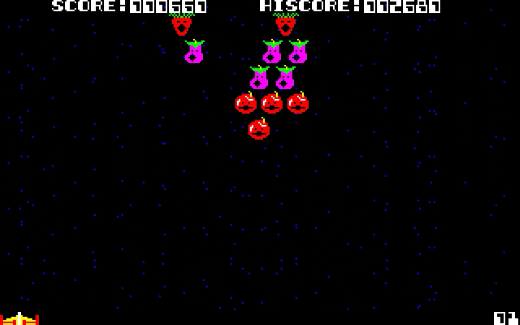 敵編隊は、上部のにんじんが2つ、その下のなすが4つ、更に一段下にもなすが7つ、そして下の2段にりんごが8つと9つの、合計で30の野菜が並んでいました。上空に待機している間、ベジタブルたちは攻撃をしてくることはありませんが、時間経過とともにりんごやなす、そして最上部に位置しているにんじんが直下のなすを引き連れて体当たり&青虫攻撃を仕掛けてきます。このときに倒すとなすとりんごは得点が倍になるほか、にんじんはなすを2つ倒してから破壊すると800点がゲットできました。ただし、野菜の攻撃は思った以上に激しいほか、横画面のため敵との距離も近く、自機にかなり接近した状態で青虫を撃たれることも……。そのため、気づいたときには被弾してミスになっていたりするので、とにかく先手必勝で敵の数を減らすのがコツとなります。
