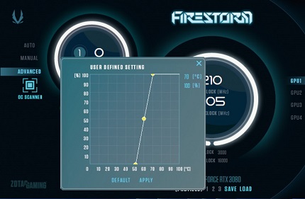 まずは、手軽な手段を試してみよう。ZOTAC製ビデオカードを制御できる「FireStorm」アプリを使って、ファンの回転数をアップさせよう、というものだ。基本的には温度が高くなるほど、ファンの回転数が上がるように自動で制御されているが、オリジナルのファン制御プリセットを作ることも可能。70℃でファンの回転数が100%まで上がるように設定したが、GPU温度は下がったものの、GPUが出す熱自体が減るわけではないため、CPU温度はほぼ変わらず。動作音がアップするわりには効果は薄かった。
