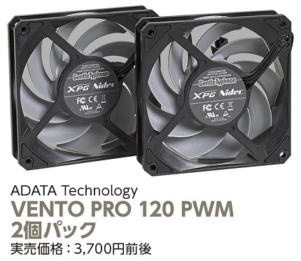 選んだのは、ADATAのVENTO PRO 120 PWMだ。12cm角ファンで、かつて大ヒットしたNidecの「Gentle Typhoon」の設計を受け継いでおり、高い静圧と風量が特徴。単体に加え、2個、3個パックもあり、電源コネクタを連結できるデイジーチェーンに対応している点も選択した理由だ。