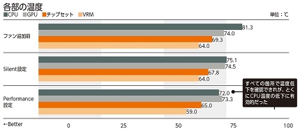 PCケースのH500iは、ファンコントローラが搭載されており、標準搭載の背面と天板のファンも含め「CAM」アプリで一括制御できる。静音重視の「Silent」設定と冷却重視の「Performance」設定の両方を試したが、測定したすべての箇所の温度が下がったのは後者だ。ただ、騒音は大きくなる。SilentでもCPUとチップセット温度はしっかり下がっており、十分“効果アリ”と言えるだろう。冷却力と動作音はトレードオフの関係にある。そのバランスを追求するなら、CAMアプリで独自のプリセットを作るのもアリだ。