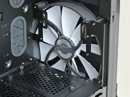Mini-ITX対応PCケースと見まがうコンパクトなサイズとフォルムながら、microATX対応マザーボードや合計12台のストレージが組み込める拡張性の高いPCケースだ。シャドーベイ横に12cm角ファンを備えるほか、ビデオカードの真上に8cm角ファンを2基組み込めるので、高性能ビデオカードも安心して運用できそうだ。