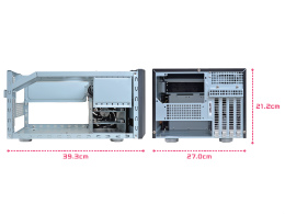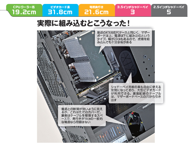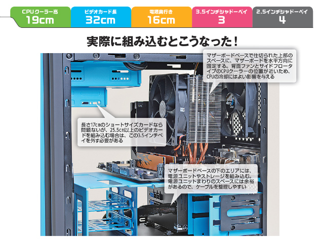 内部スペースを上下に分け、マザーボードを水平に設置する構造を採用している。そのため、一般的なミニタワーよりもさらに背が低いコンパクトサイズながら、高さ19cmものCPUクーラーが利用できる。内部は広く、初心者でも簡単に組み込みが行なえる。