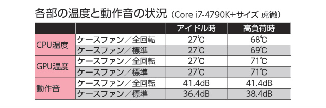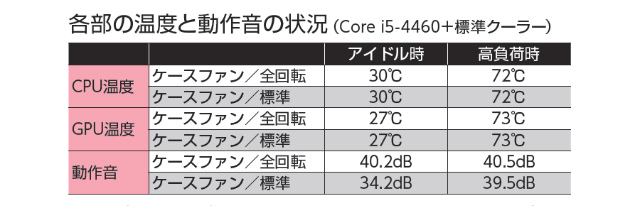 室温:21.5℃、暗騒音:31.4dB、動作音測定距離:ケース正面から20cm、アイドル時:OS起動10分後の値、高負荷時:OCCT4.4.1 POWER SUPPLYテストを10分間動作させたときの最大値、各部の温度:使用したソフトはHWMonitor 1.27で、CPUはCPU TemperaturesのPackage、GPUはTemperaturesの値、ケースファンの設定:「全回転」は100%、「標準」はFan Xpert 3の「標準」設定