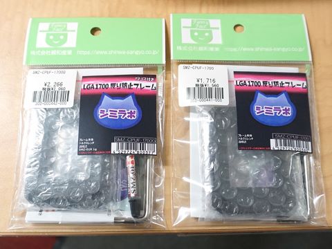 LGA1700対応CPUの反りを防ぐというアルミフレーム。店頭価格は1,716円で、グリス(SMZ-01R-01)付属モデルは2,266円。