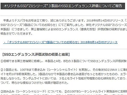ドスパラを運営するサードウェーブは4月3日(水)、ドスパラオリジナルSSD「Z1」シリーズに関して、第三者機関が実施したSSDエンデュランス(書換え耐性)評価試験の結果を公表した。