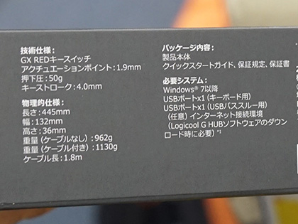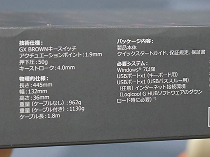 本体サイズは455×36×132mm。重量は1,130g(USBケーブルを除く)。搭載スイッチの仕様はキーストロークが4.0mm(接点1.9mm)、押下圧は50g、7,000万回のキーストローク耐性を備えている。