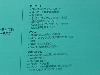 キーボードはメンブレンタイプで、多少の液体(最大60ml)にも耐えられる耐水性を有している。配列は日本語108レイアウトで、メディアコントロールやアプリへのショートカットキーを搭載している。