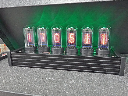 これは、USB電源で動作するデジタル表示の置き時計で、6つのニキシー管を並べたような独特のデザイン。実際にはニキシー管ではなく、ガラスチューブに液晶パネルを内蔵したものだが、数字がオレンジ色でぼんやりと表示される様はよく似ており、レトロな雰囲気が味わえる。