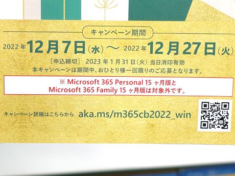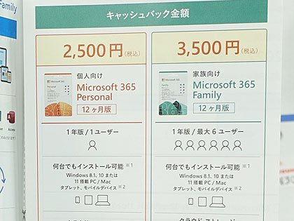 対象製品はMicrosoft 365 PersonalまたはFamilyの12か月版(共にPOSA カード版またはダウンロード版)で、キャッシュバック金額はPersonal 12か月版が2,500円、Family 12か月版が3,500円。なお、15か月は対象外。