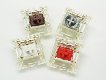 LEDバックライトの光をより拡散しやすくなったというキースイッチ。Red・Brown・White・Silverの4種類が入荷しており、店頭価格は49~66円。