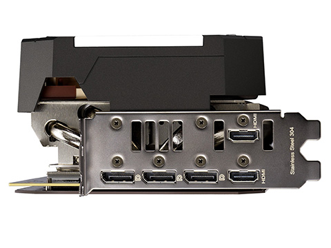 主な仕様は、ブーストクロックがデフォルトモード時2,610MHz、OCモード時2,640MHz。搭載メモリはGDDR6X 16GB(256bit)、メモリクロックは23Gbps。映像端子はDisplayPort 1.4a×3、HDMI 2.1a×2。補助電源端子は16ピン×1。本体サイズは310×144.8×87.5mm。