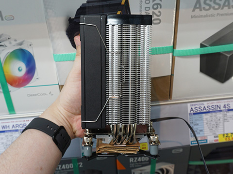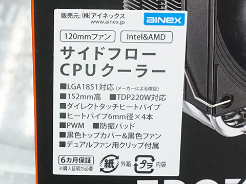 これは、120mmファンを1基搭載したサイドフロー型CPUクーラー。6mm径の銅製ヒートパイプ×4本とアルミニウム製ヒートシンクを搭載するモデルで、CPUソケットはIntel・AMDの両方に対応するほか、Intelの次世代CPUソケット「LGA1851」に対応することがメーカー独自に検証されている。