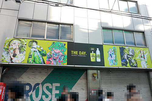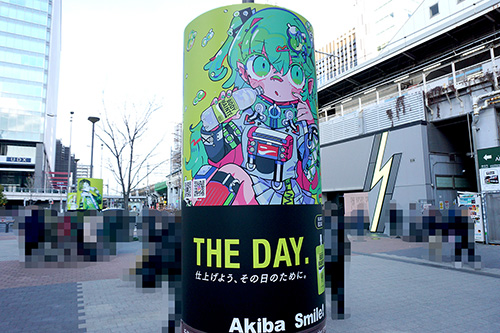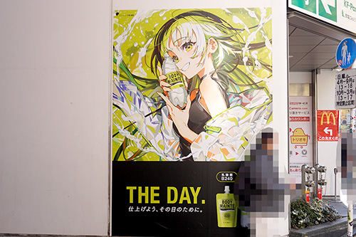 大塚製薬のスポーツドリンク「ボディメンテ」の広告が秋葉原の各所で展開されていました。使用されているイラストは人気イラストレーターによる描き下ろしで、蛍光色を基調にしたポスターが目を引きますね。