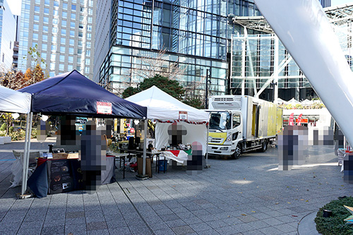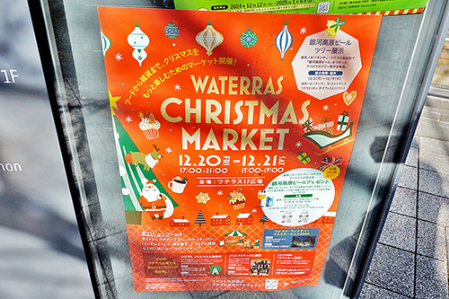 ワテラスの広場で、クリスマスマーケットが開催されていました。ホットドックなどの軽食や、パンや焼き菓子、クリスマス雑貨などのショップが出店。親子連れで賑わっていました。
