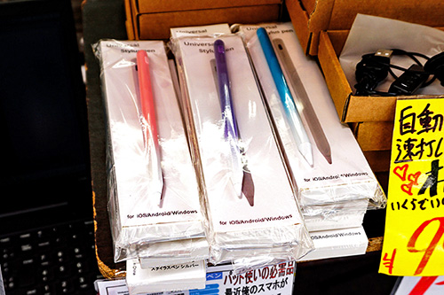 あきばお~禄號店では、USB充電式のデジタルスタイラスペンが特価販売されていました。30分の高速充電で4時間動作、価格は990円。「最近俺のシマホが俺の指を無視する…」とポップには記載があり、操作性の向上だけでなく、指先の乾燥肌/老化対策の面も意識されているようです。