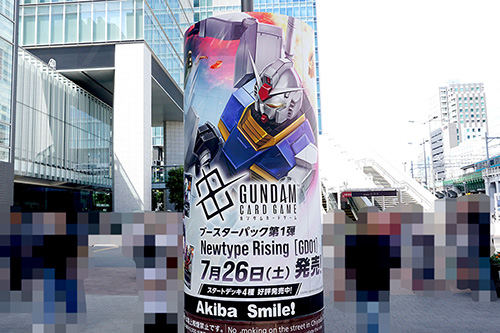 JR秋葉原駅前の電気街口西側広場の円柱広告に、7月26日から販売開始予定の「ガンダムカードゲーム ブースターパック第1弾」の広告が登場。