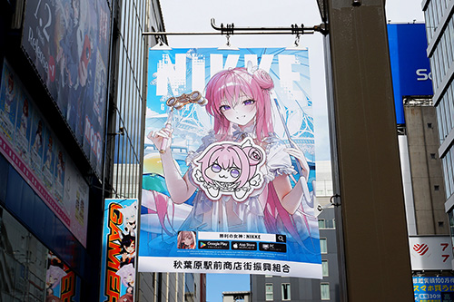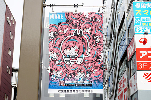 「勝利の女神:NIKKE」ゲーム内夏イベント「BOOM!THE GHOST!」の開催を記念した広告が秋葉原の各所に掲載されていました。「BiTO AKIBA PLAZA」および「JR秋葉原駅駅前街灯フラッグ」への広告掲載は7月いっぱいまで。