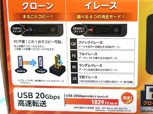 PCレスでSSD間のデータコピーや消去が可能で、同容量のほか小容量→大容量SSDへのコピーにも対応する。