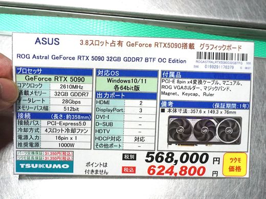 ASUSのコネクタレスデザイン「BTF」に対応したGeForce RTX 5090搭載ビデオカード「ROG-ASTRAL-RTX5090-O32G-BTF-GAMING」が登場、8日(金)から販売が始まる。