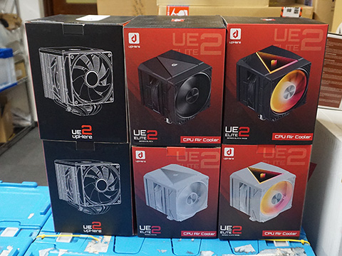 upHereのツインタワー型CPUクーラー「UE2」シリーズが登場。ラインアップはヒートパイプを6本搭載した「UE2」。ヒートパイプを8本搭載した「UE2 Elite」、UE2 EliteのARGBファン搭載モデル「UE2 Elite ARGB」で計3モデル。各種本体カラーはブラックとホワイトの2色が用意されている。