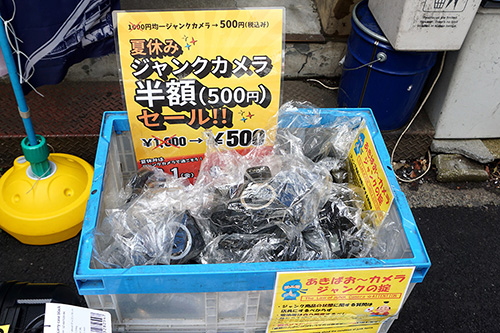あきばお~零の店頭では、「夏休みジャンクカメラ半額(500円)セール!!」が8月31日(日)まで開催中。店員への質問などもNGとされているので、完全にノーサポートの特価品です。
