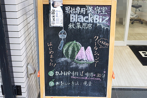 取材中に見かけた黒板アートをご紹介。ブラックビズ 秋葉原駅昭和通り口店は、夏に合わせた涼しげなイラストとともに+120円でクールシャンプーのオプションが選択できる事をアピール。