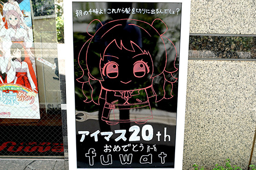 美容室fuwatは、アイマスシリーズ20周年を祝ったイラストを掲載。ムーランAKIBA本店は、1階で買取受付が始まったことをマスコットキャラクターのイラストとともに掲載していました。