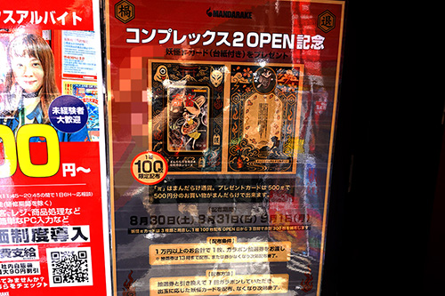まんだらけコンプレックスでは、8月30日(土)から営業開始予定の「まんだらけコンプレックス2」オープン記念キャンペーンの告知が掲載されていました。8月30日(土)~9月1日(月)の3日間、まんだらけでの買い物で使える「妖怪πカード」を条件付きで配布予定とのことです。