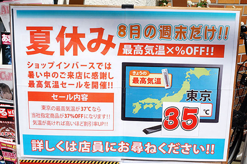 中古PCを中心に販売するショップインバース 秋葉原2号店では、当日の最高気温に応じて値引率が変わる「最高気温セール」が開催されていました。最高気温が35℃なら指定商品が35%OFFになるといったユニークなセールになっています。8月中の毎週末に開催するとのことで、狙えるチャンスはまだまだあります。
