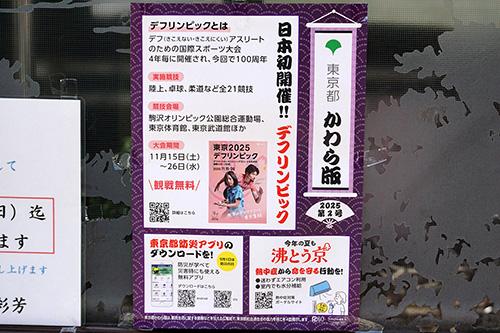中華料理店の四川史菜彩芳の店頭に、東京都かわら版 2025 第2号が掲載されていました。内容は11月に開催されるデフリンピックの告知や、夏の熱中症への注意喚起、防災情報などとなっています。