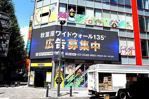 ゲームパニック秋葉原の店頭に大型デジタルサイネージが設置されていました。広告募集中で、名称は「秋葉原ワイドウォール135°」となるようです。また、アキモバ!壁面にもデジタルサイネージが設置されていました。