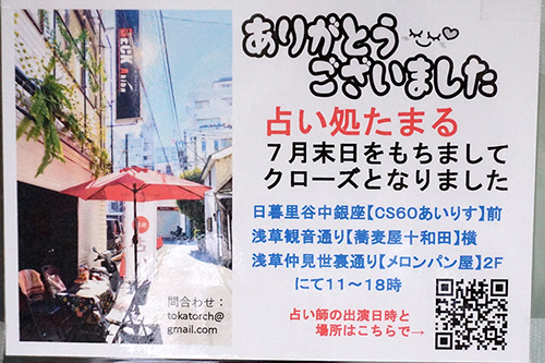 BECKアキバの軒先で営業していた「占い処たまる」が7月末で営業を終了。なお、日暮里や浅草方面では継続して営業を行っているとのことです。