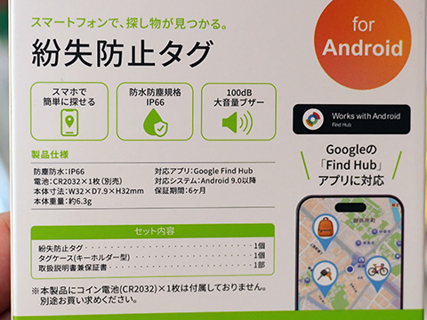 対応OSはAndroid 9.0以降。作動範囲は屋内10~15m/屋外40~50m。サイズは約32×7.9×32mm。重量は6.3g。対応電池はCR2032(別売り)。