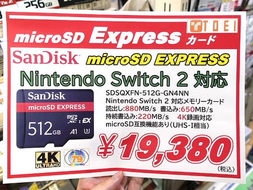 Nintendo Switch 2動作確認済みというmicroSD Expressカードで、以前入荷した128GB/256GBに続く容量512GBのモデル。