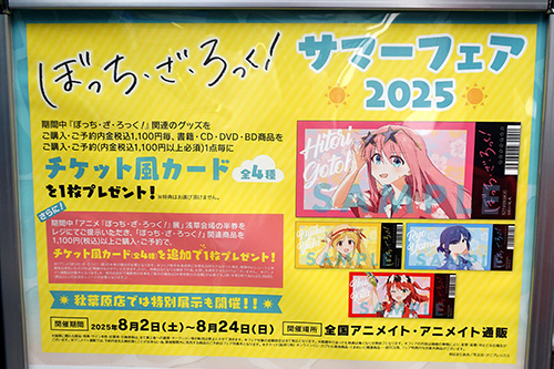 アニメイト秋葉原では、「ぼっち・ざ・ろっく!」関連グッズ購入でイベントチケット風のカードをプレゼントする「ぼっち・ざ・ろっく!サマーフェア2025」が開催されていました。アニメイト秋葉原1号館の4階では特別展示も行っています。どちらも期間は8月24日(日)まで。