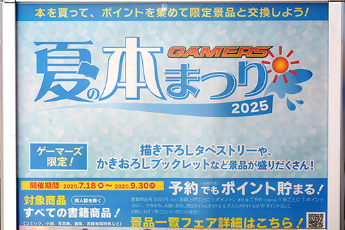 AKIHABARAゲーマーズ本店では、「ゲーマーズ 夏の本祭り2025」が開催されていました。ゲーマーズ限定の描き下ろしタペストリーやブックレットなど、景品も盛りだくさん。開催期間は9月30日(火)まで。